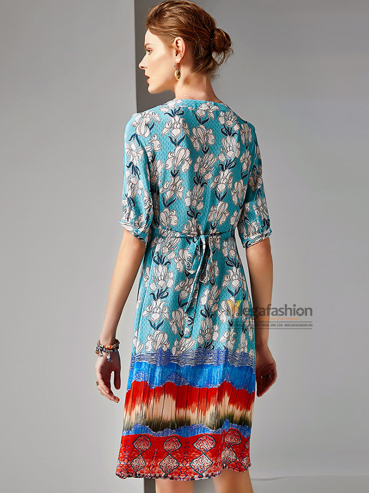 Đầm ôm suông thiết kế dáng tay lửng, cổ V. Đầm có eo xếp ly thắt nơ. Đầm nổi bật với họa tiết hoa ly phối sóng biển. Đầm được may bằng chất liệu vải lụa cao cấp.