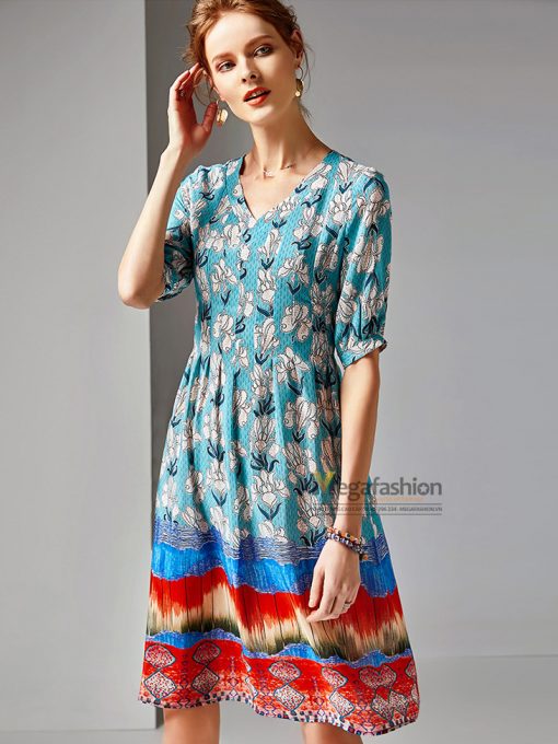 Đầm nổi bật với họa tiết hoa ly phối sóng biển. Đầm được may bằng chất liệu vải lụa cao cấp.