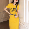 Đầm thiết kế dáng suông. Thiết kế cổ đầm dáng tròn, tay đầm dáng ngắn. Đầm tone trơn phối chữ “2099 Valentino”.