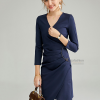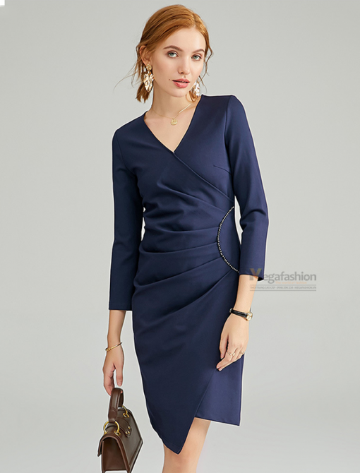 Đầm thiết kế dáng suông. Thiết kế cổ đầm dáng chéo, tay đầm dáng dài. Đai eo đầm thiết kế chiết ly đính đá, vạt đầm chéo.