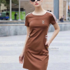 Đầm thiết kế dáng suông. Thiết kế cổ đầm dáng tròn, tay đầm dáng ngắn. Đầm tone trơn phần viền hông phối họa tiết kẻ sọc.