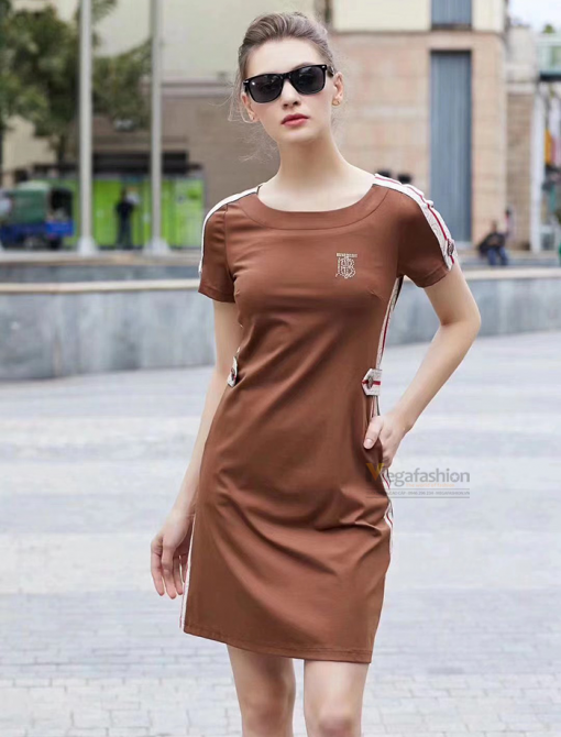 Đầm thiết kế dáng suông. Thiết kế cổ đầm dáng tròn, tay đầm dáng ngắn. Đầm tone trơn phần viền hông phối họa tiết kẻ sọc.