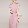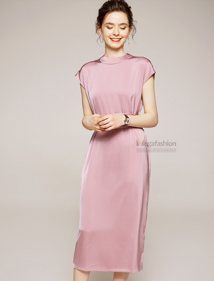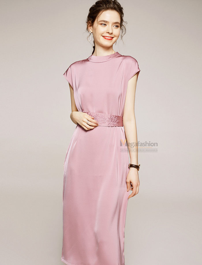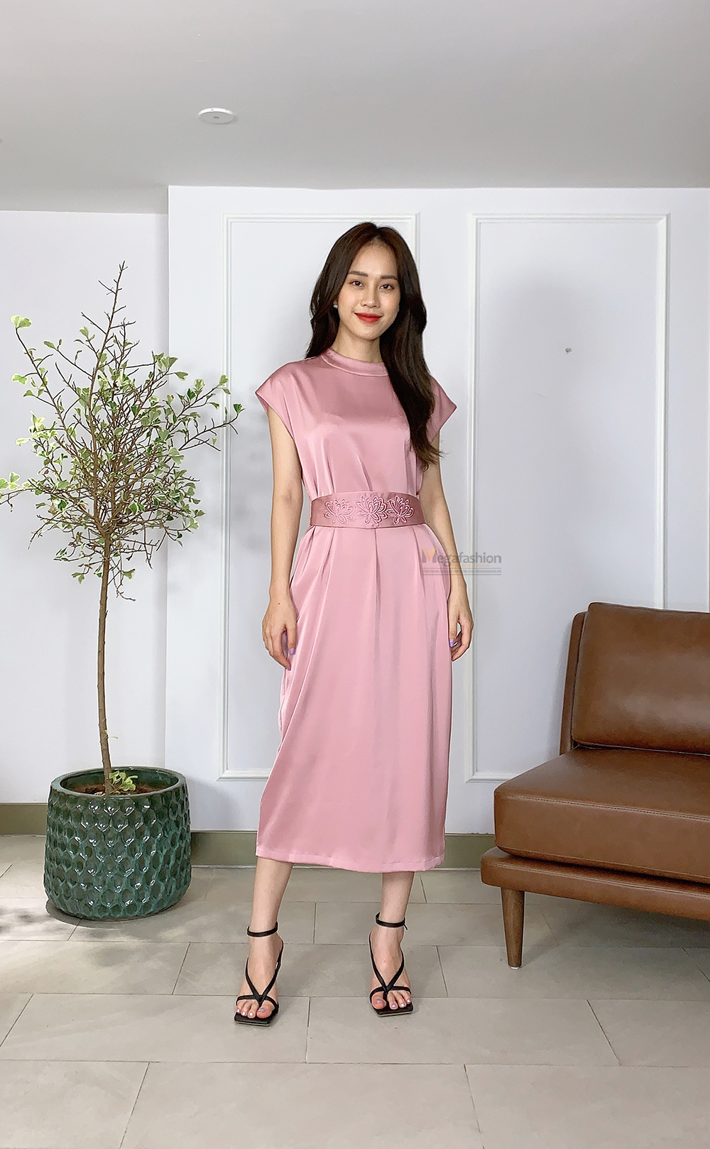 Đầm thiết kế dáng suông. Thiết kế cổ cao, tay đầm dáng hến. Đầm tone trơn màu, eo thắt đai phối họa tiết.