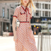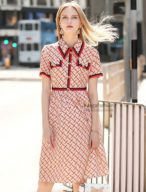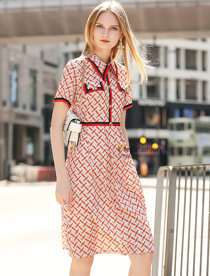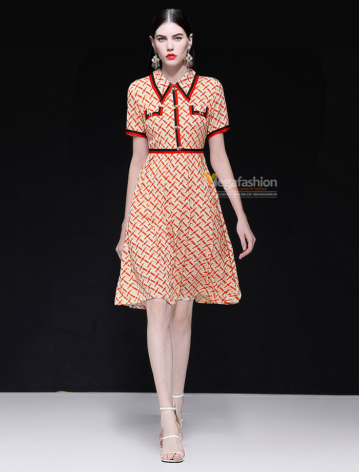 Đầm thiết kế dáng xòe. Thiết kế cổ đầm dáng cổ bẻ, tay ngắn phối viền. Đầm đính cúc, đầm nổi bật cùng họa tiết hình khối.