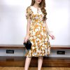 Đầm thiết kế dáng xòe. Thiết kế cổ đầm dáng tròn thắt nơ, tay đầm dáng lửng bo chun. Đầm nổi bật cùng họa tiết hoa lá.