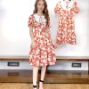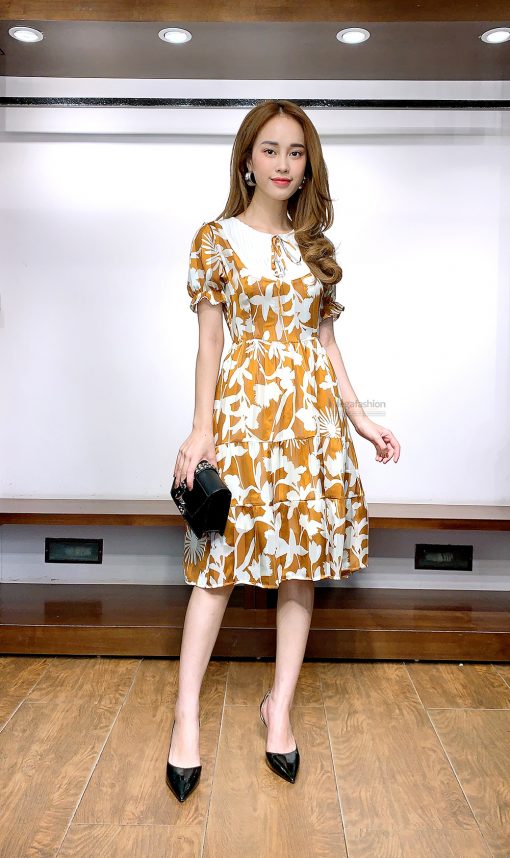 Đầm thiết kế dáng xòe. Thiết kế cổ đầm dáng tròn thắt nơ, tay đầm dáng lửng bo chun. Đầm nổi bật cùng họa tiết hoa lá.